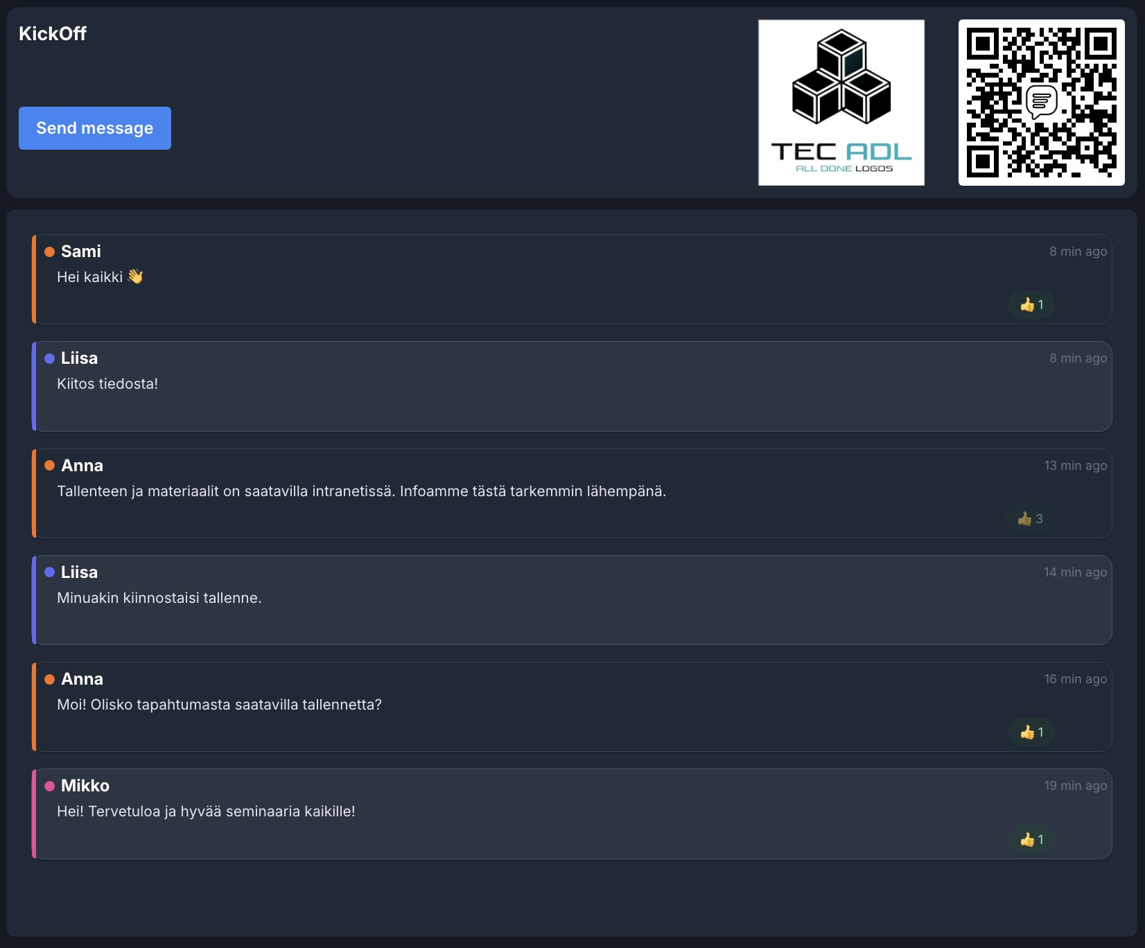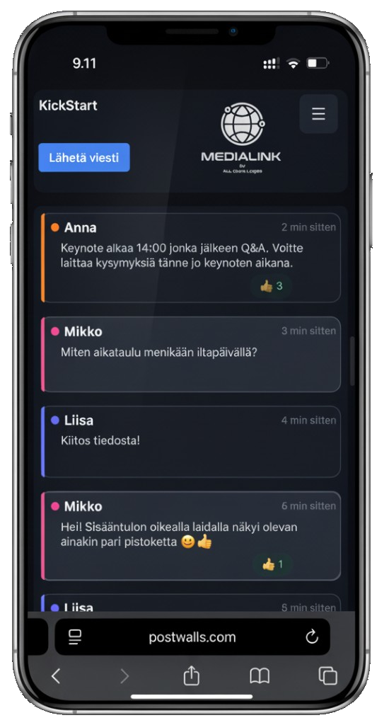 Postwalls on yksinkertainen viestiseinä tapahtumiin. Osallistujat lähettävät viestejä suoraan puhelimellaan. Ei sovellusta, ei kirjautumista, ei kitkaa. Sinä päätät mitä näytöllä näkyy. Automaattinen suodatus pitää sisällön asiallisena — asetettu turvalliseksi oletuksena, ilman jatkuvaa valvontaa.
